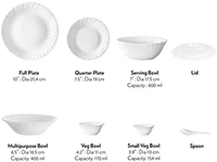 - Package Contents: 6 - Piece Full Plate, 6 - Piece Mini Veg Bowl, 6 - Piece Veg Bowl, 6 - Piece Quarter Plate, 2 - Piece Serving Bowl, 2 - Piece lids(For Serving Bowl), 6 - Piece Spoons, 1 - Piece Multiutility Bowl