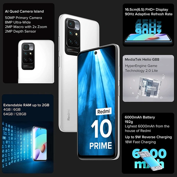 Redmi 10 Prime (Astral White 4GB RAM 64GB ROM |Helio G88 with extendable RAM Upto 2GB |FHD+ 90Hz Adaptive Sync Display